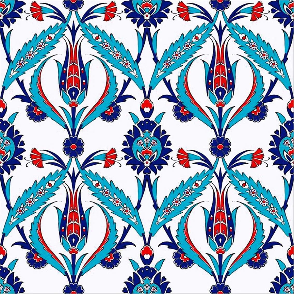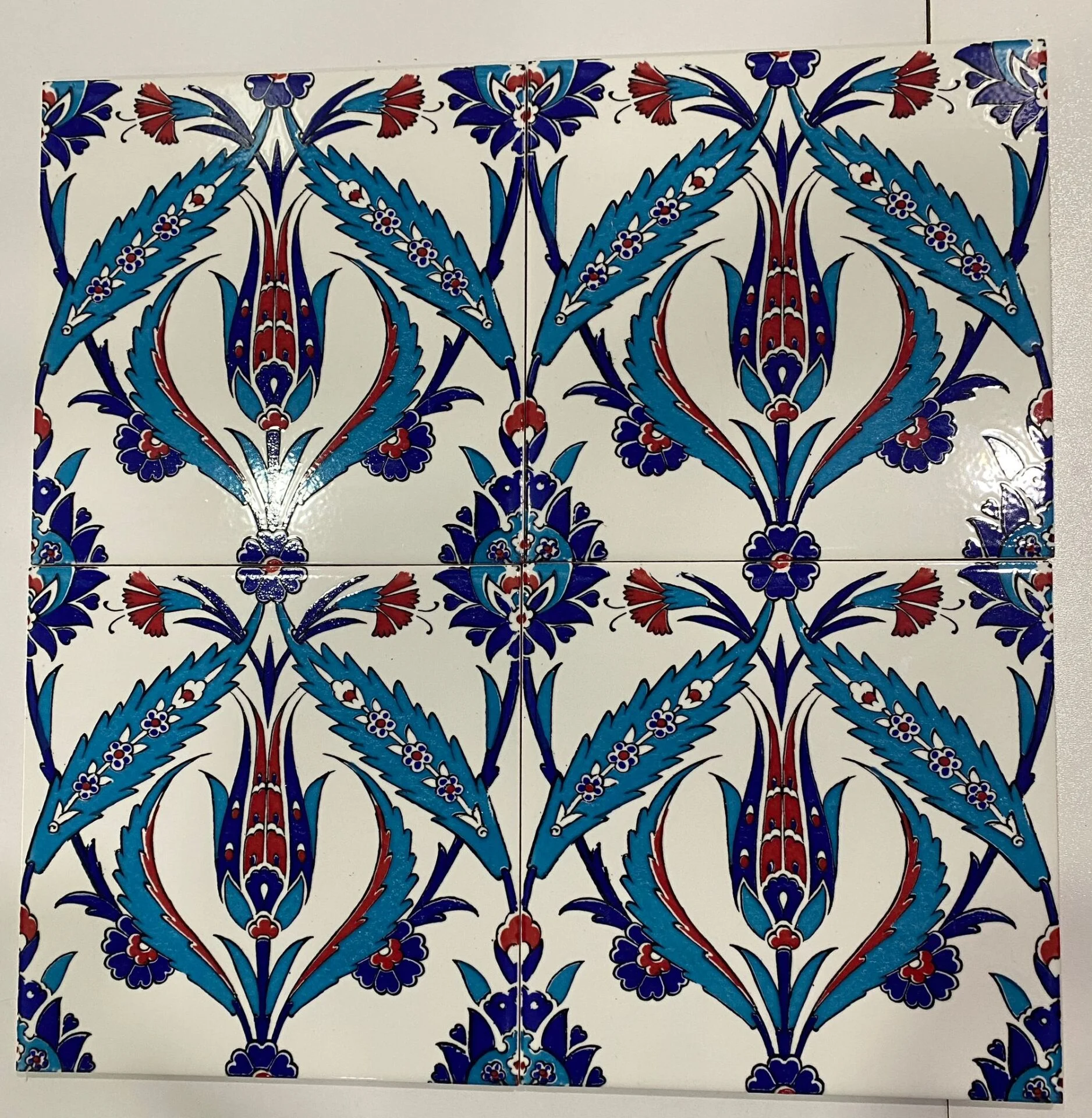 Bu özel tasarımda, geleneksel lale motifi ve çintemani benzeri kıvrımlı hatlar ön plana çıkar. Kobalt mavisi, Türk kırmızısı ve turkuaz tonlarının canlılığı, mekâna ferah bir hava katar.